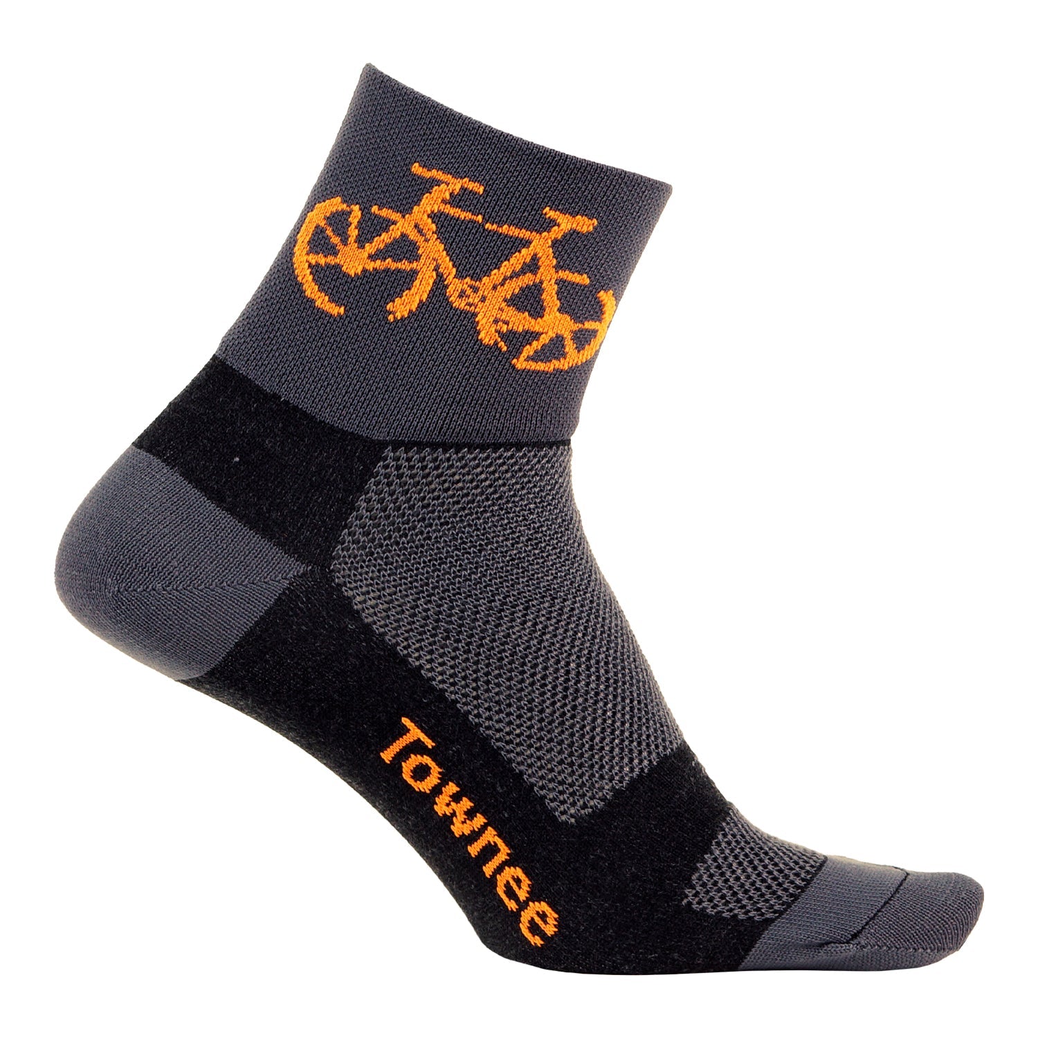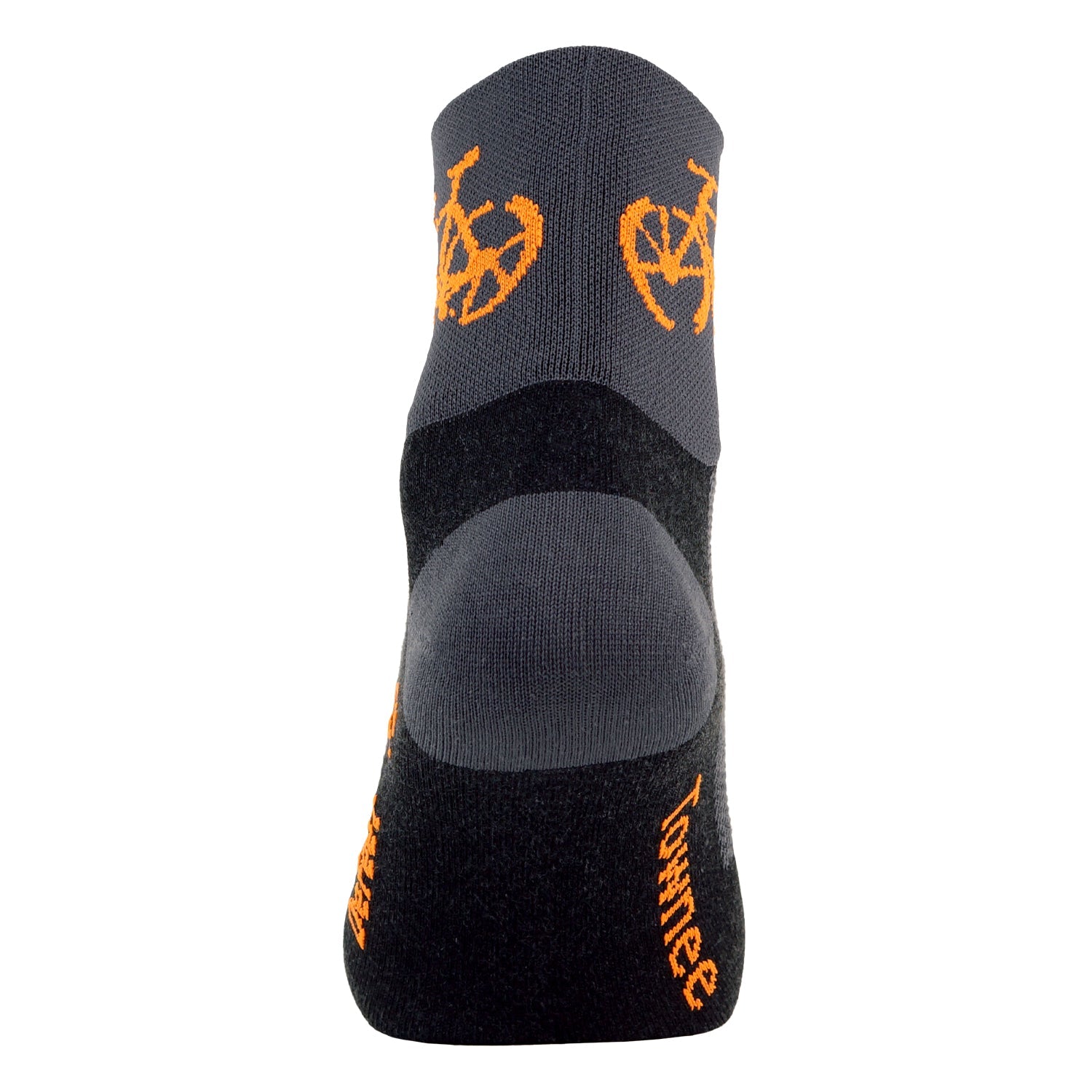 Aireator 3" Townee quarter cuff sock is a dark grey sock featuring an orange bicycle on the double cuff.