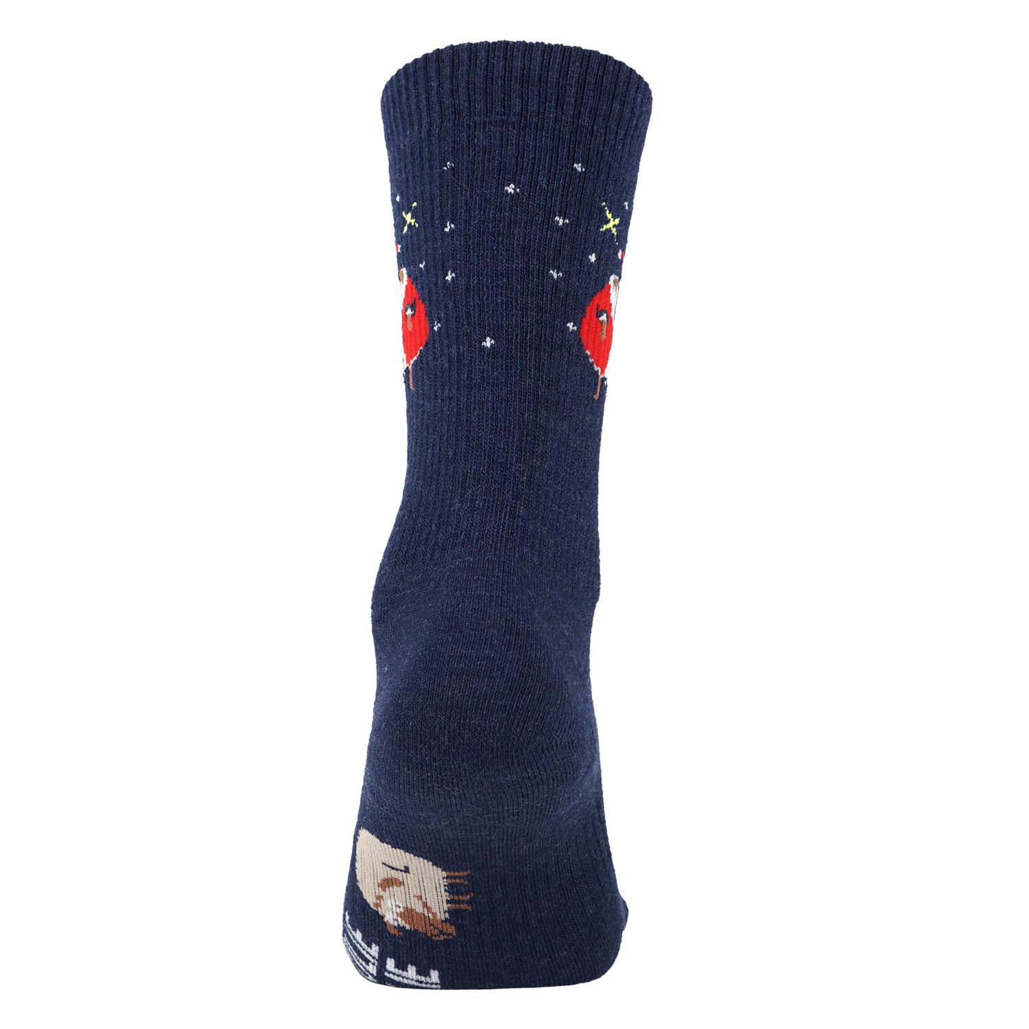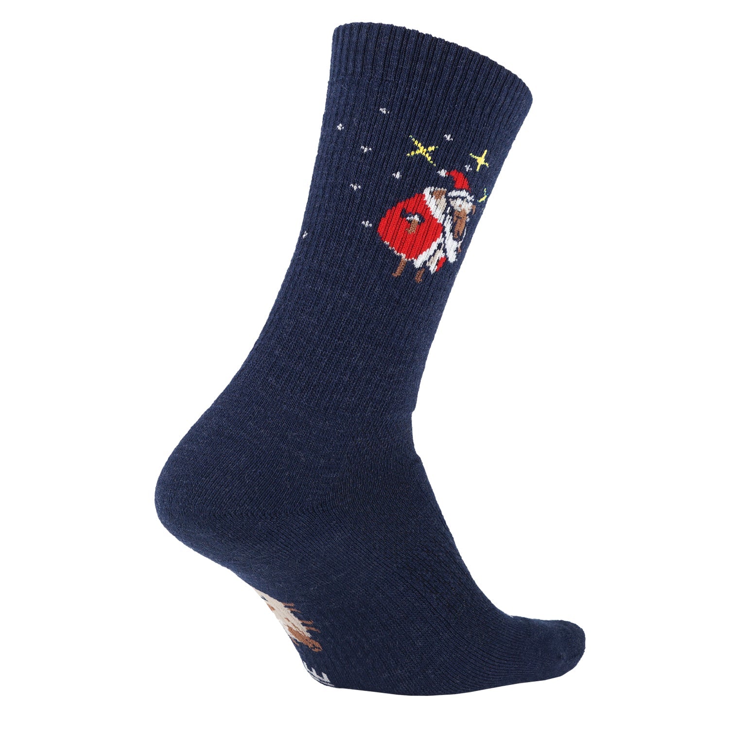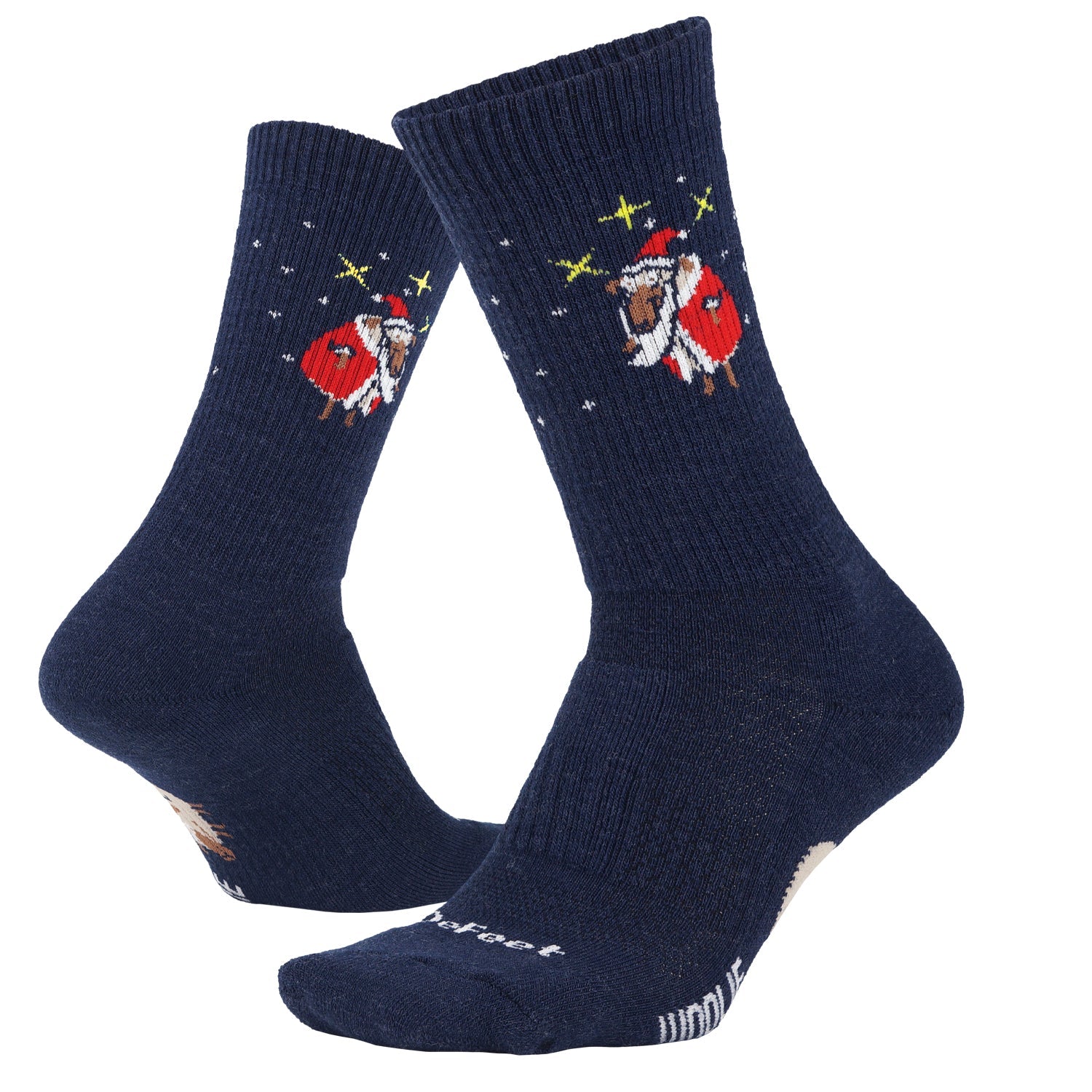 This is the Woolie Boolie 6" Holiday Lambert. Lambert is the fun loving DeFeet wool mascot that occasionally adorns our wool socks. These are knit with our very special USA grown, washed and dyed navy blue Merino wool. Lambert, floating under the stars in a Santa suit.