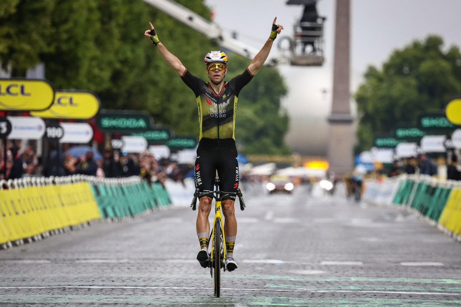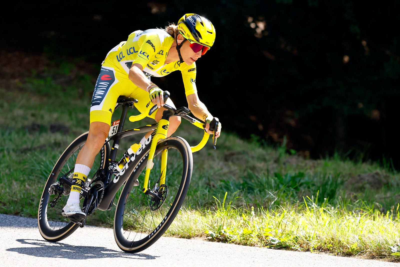 Cyclist Pauline Ferrand Prevot in a Tour de France yellow racing suit and DeFeet custom printed EVO Jet aero cycling socks elebrating on a bicycle with a crowd in the background