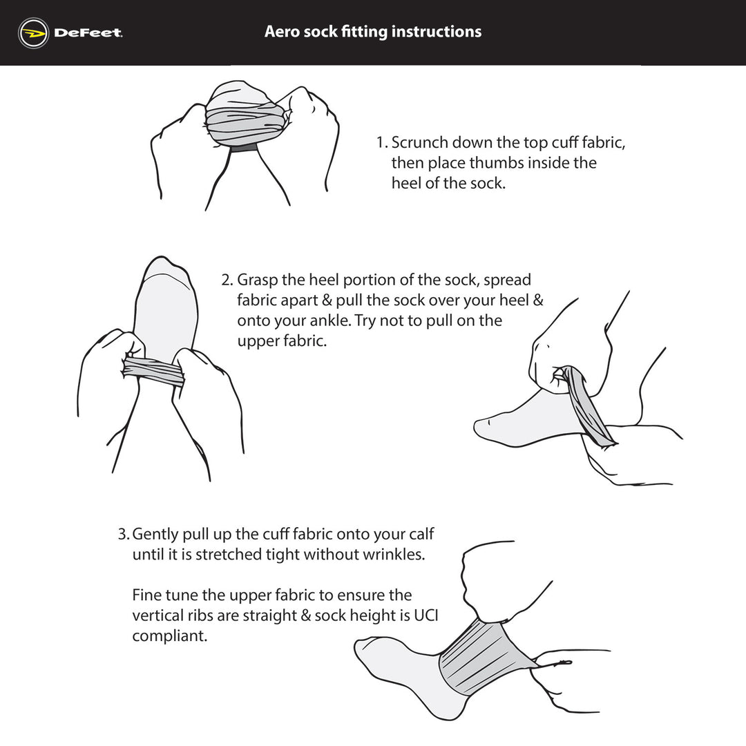 Please follow these instruction when putting on your EVO Jet aero socks. It is important that you not pull at the cuff as the sock has both vertical and horizontal seams that are vulnerable and can fail when over stretched.